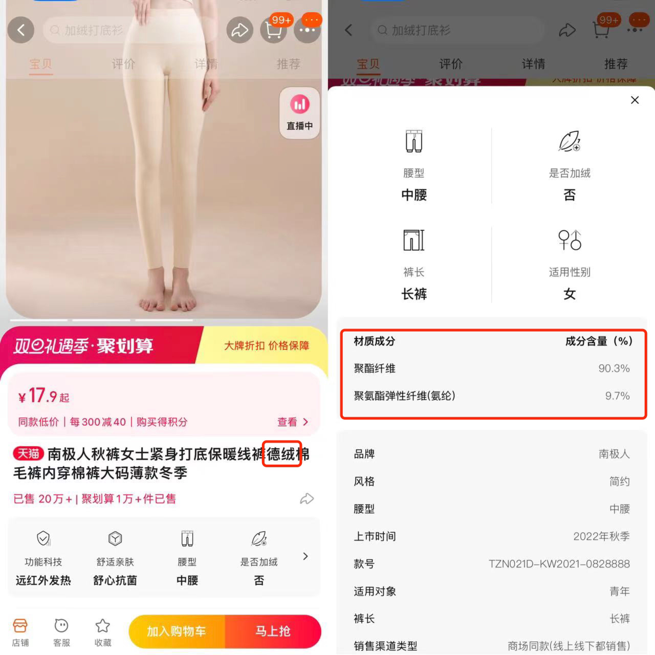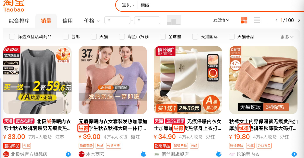 在淘宝上搜索“德绒”,相关产品销量可观。按商品销量排序,排名前十的产品中月销量最低也有2万+。或许是为了规避风险的同时能“蹭热度”,这些产品中有五个品牌并没有直接在商品标题中标明“德绒”字眼,而是在“加绒”的后面加了一个“德”字。