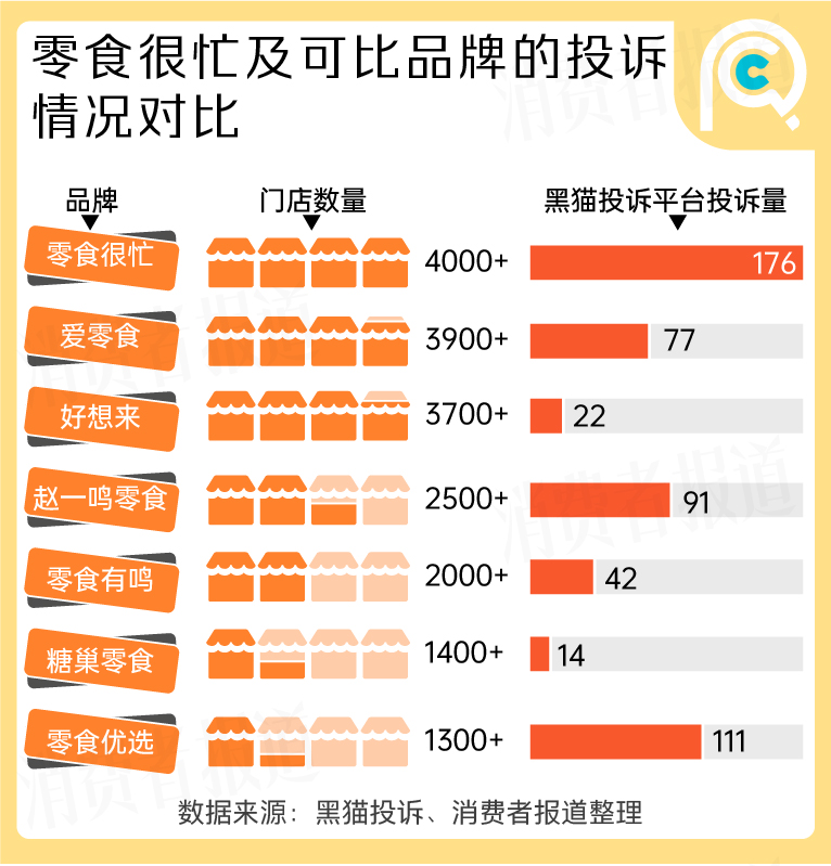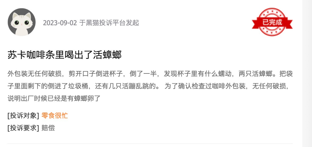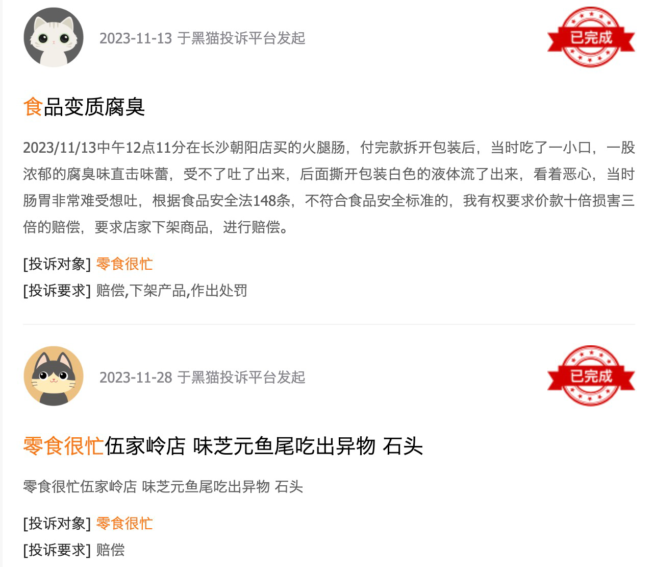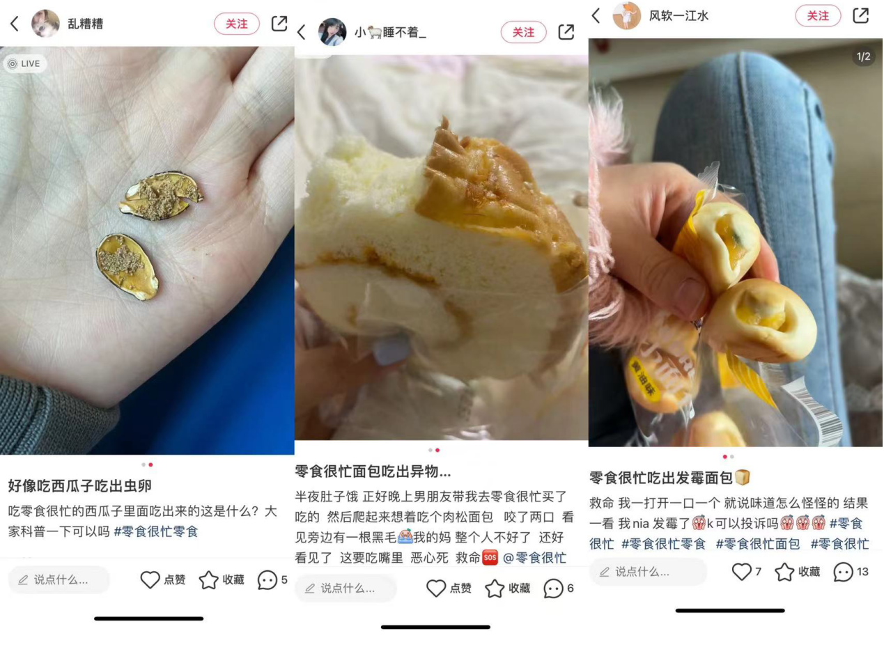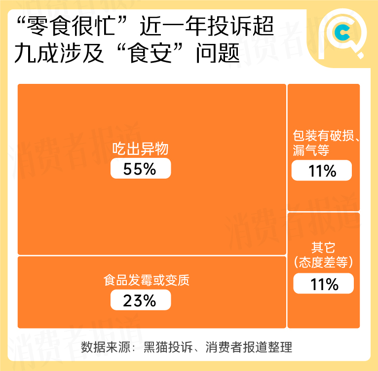 咖啡条里倒出活蟑螂,腰果里吃出老鼠屎,火腿肠撕开包装后有黏液喷出……在今年近百起相关投诉中,超九成与食品安全有关,其中53起投诉指出在零食中吃出异物。据不完全统计,在同类型企业中,零食很忙的投诉量也较为突出。
