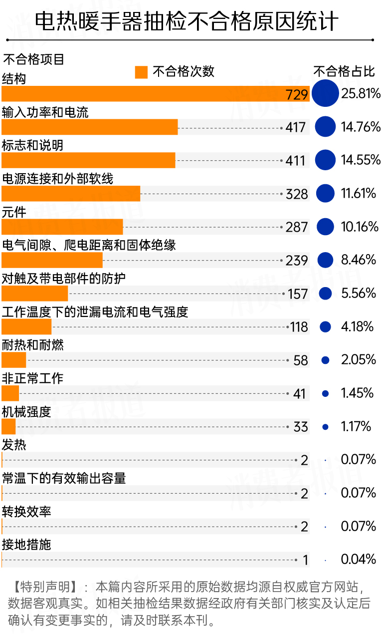 抽检数据显示,大部分不合格的电热暖手器产品,同时有多达7项指标不合格。