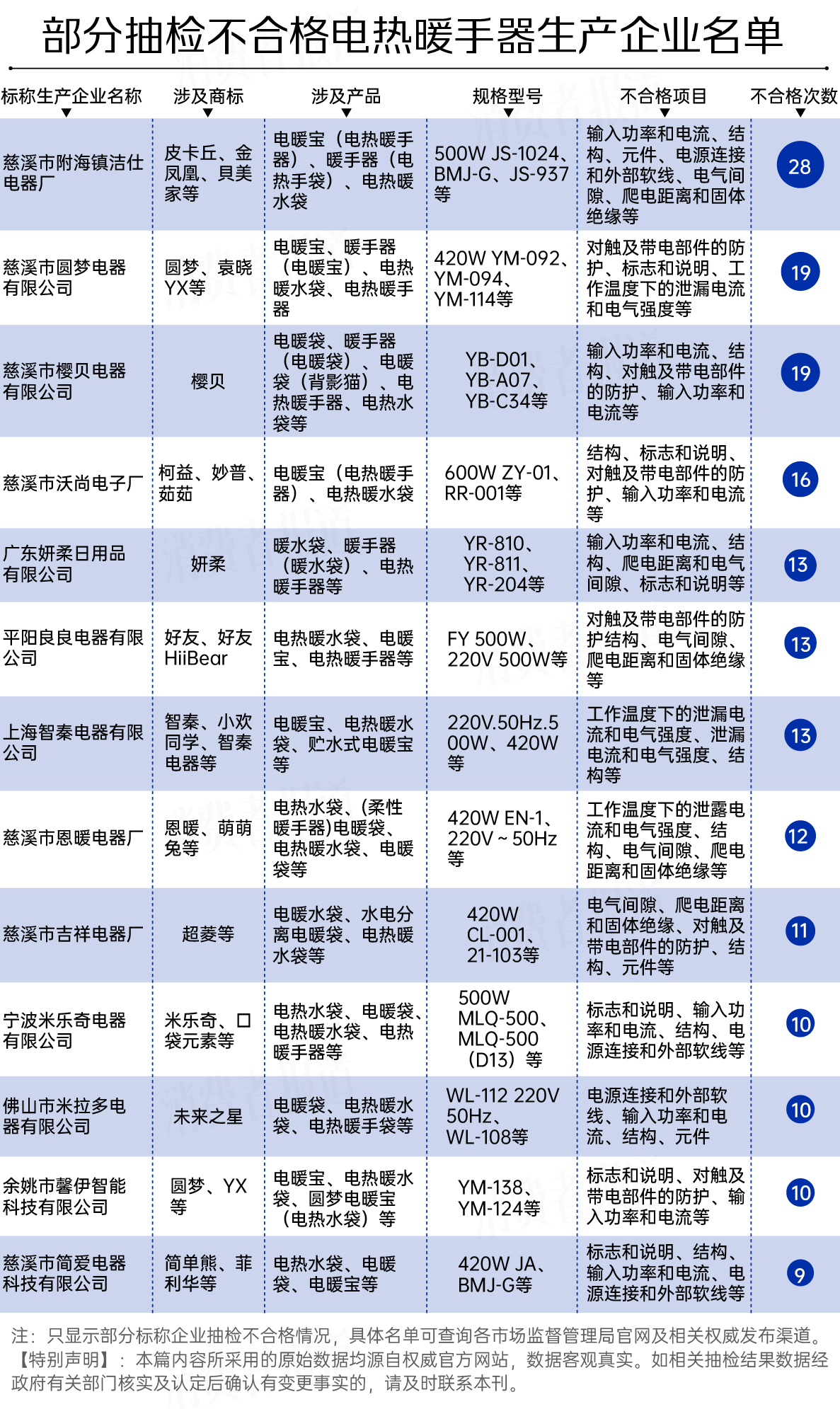 其次为慈溪市圆梦电器有限公司、慈溪市樱贝电器有限公司,二者生产的电热暖手器不合格次数均达到19次,涉及商标圆梦、袁晓YX、樱贝,涉及不合格项目为对触及带电部件的防护、标志和说明、工作温度下的泄漏电流和电气强度、输入功率和电流、结构等。