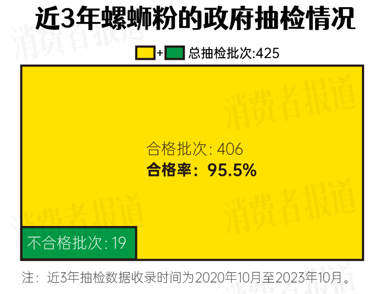 根据公开数据整理,监管部门在2020年10月至2023年10月共抽检螺蛳粉425批次,其中19批次不合格,合格率为95.5%。这相当于,平均每买20包螺蛳粉约能遇到1包不合格。