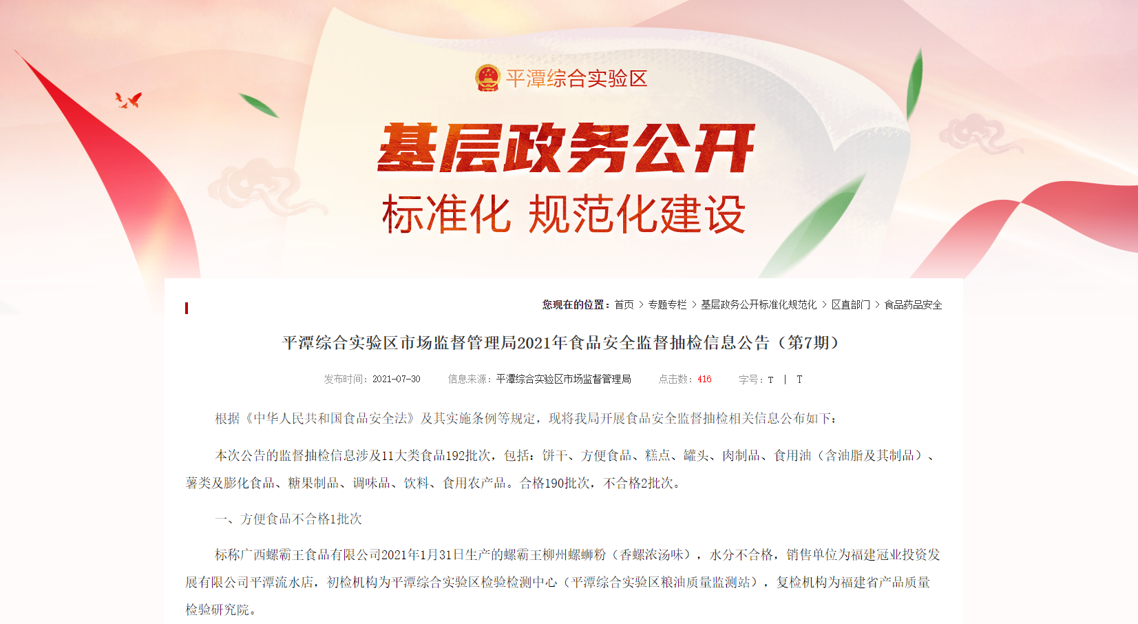 其中,根据平潭综合实验区市场监督管理局2021年食品安全监督抽检信息公告(第7期),标称由广西螺霸王食品有限公司生产的螺霸王柳州螺蛳粉(香螺浓汤味)(280g/袋)水分超标。