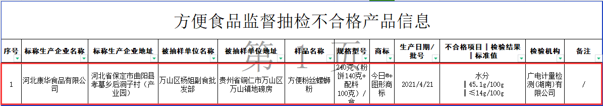 根据贵州省市场监管局关于29批次食品抽检不合格情况的通告(2021年第50期),标称由河北康华食品有限公司生产的方便粉丝螺蛳粉(240克(粉饼140克+配料100克)/盒)水分的实测值为45.1g/100g,比标准规定(≤14g/100g)高出222%。