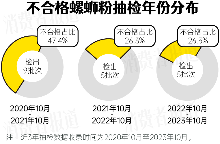 2023年11月,《消费者报道》整理了国家、省市级药品监督管理局等于2020年至2023年近3年公布的关于螺蛳粉的质量抽检情况。